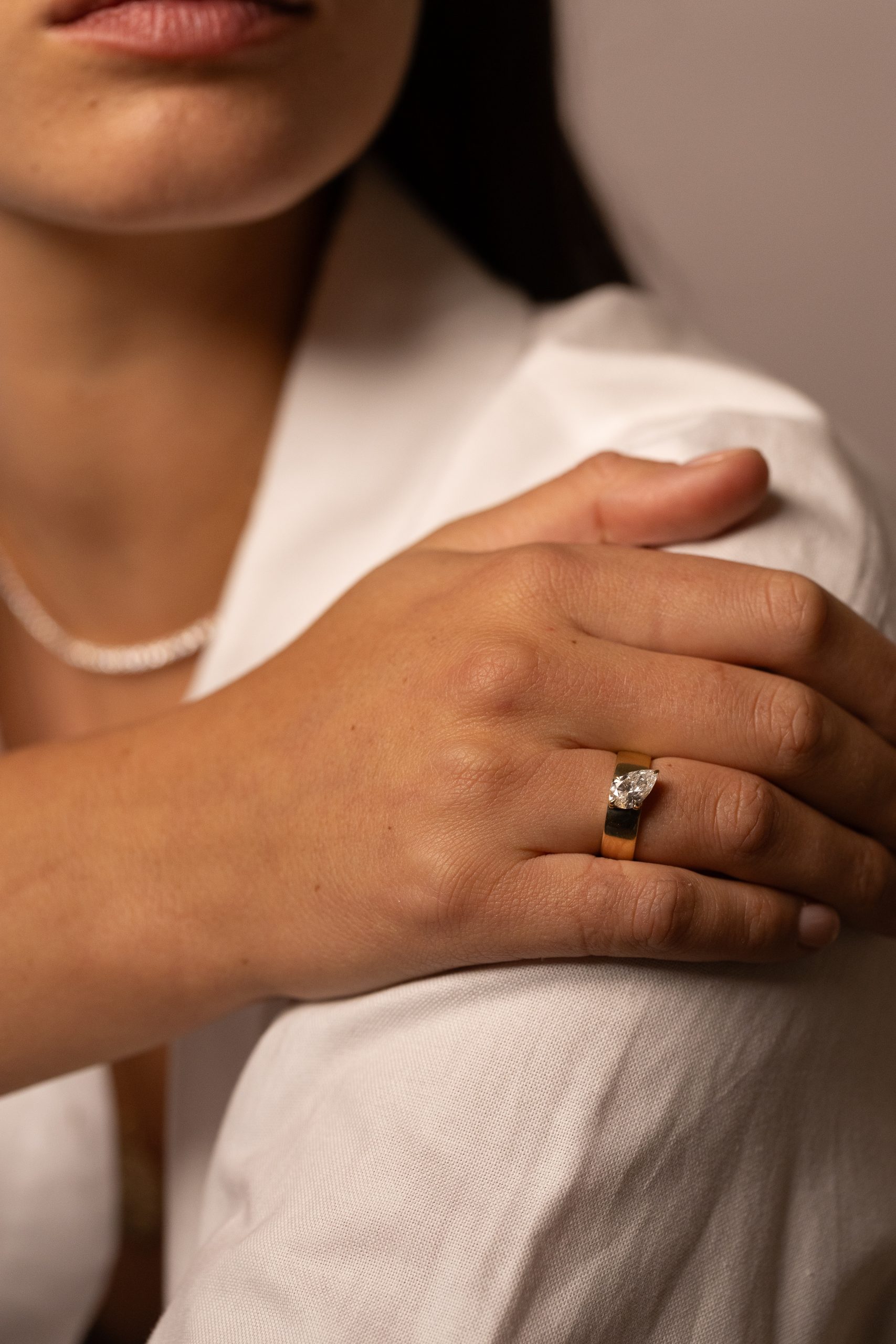 טבעת Luna Bold מציגה יהלום מרכזי בצורת טיפה,
