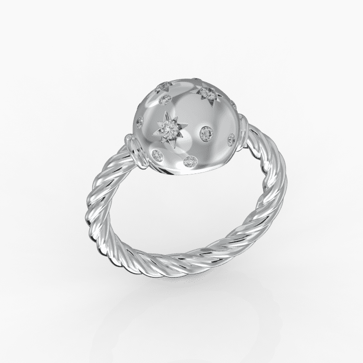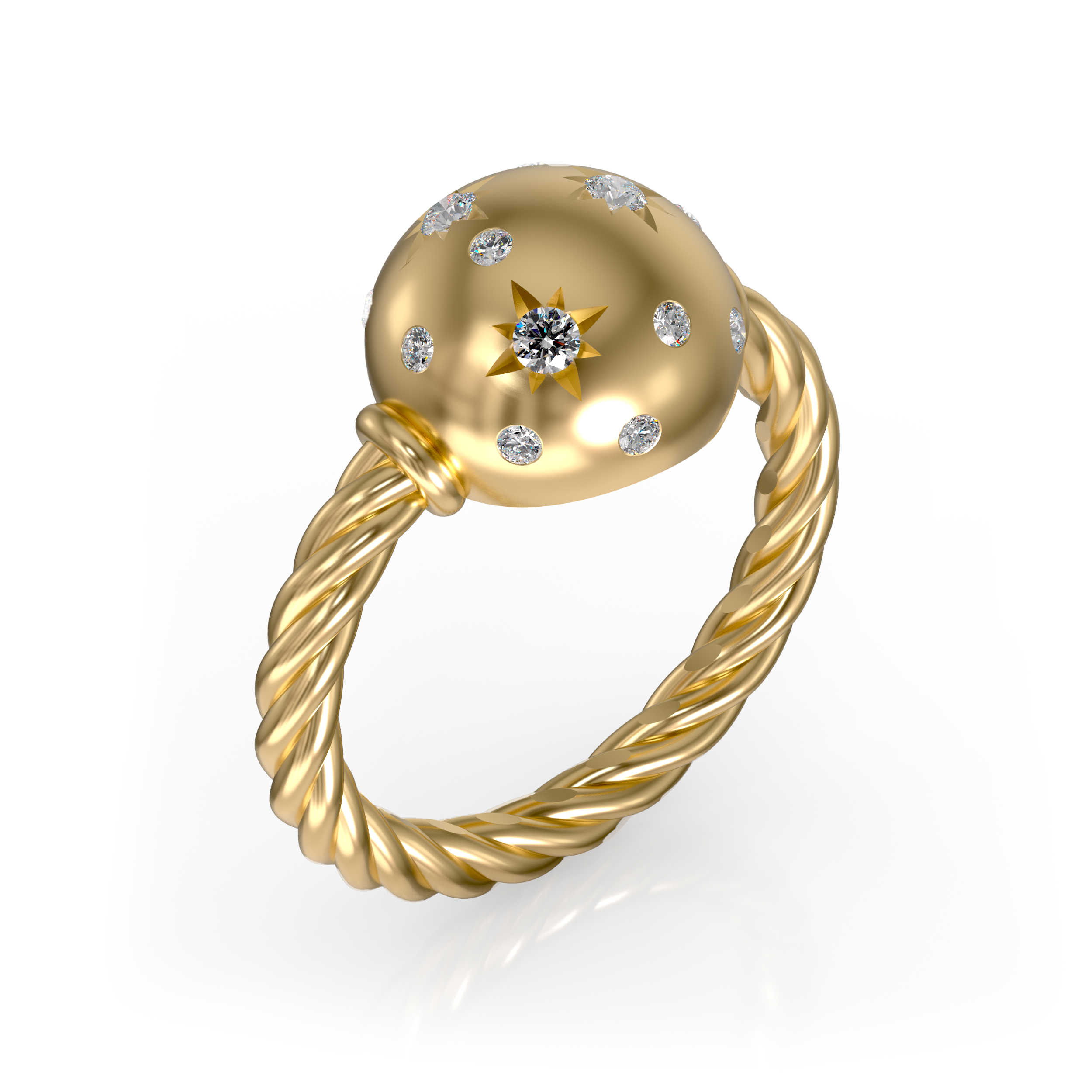 טבעת זהב 14K בעיצוב כדור עם חריטת כוכבים, משובצים ביהלומים, המזכירים כוכב גלקסיה נוצץ. טבעת מרשימה שאי אפשר להתעלם מנוכחותה.